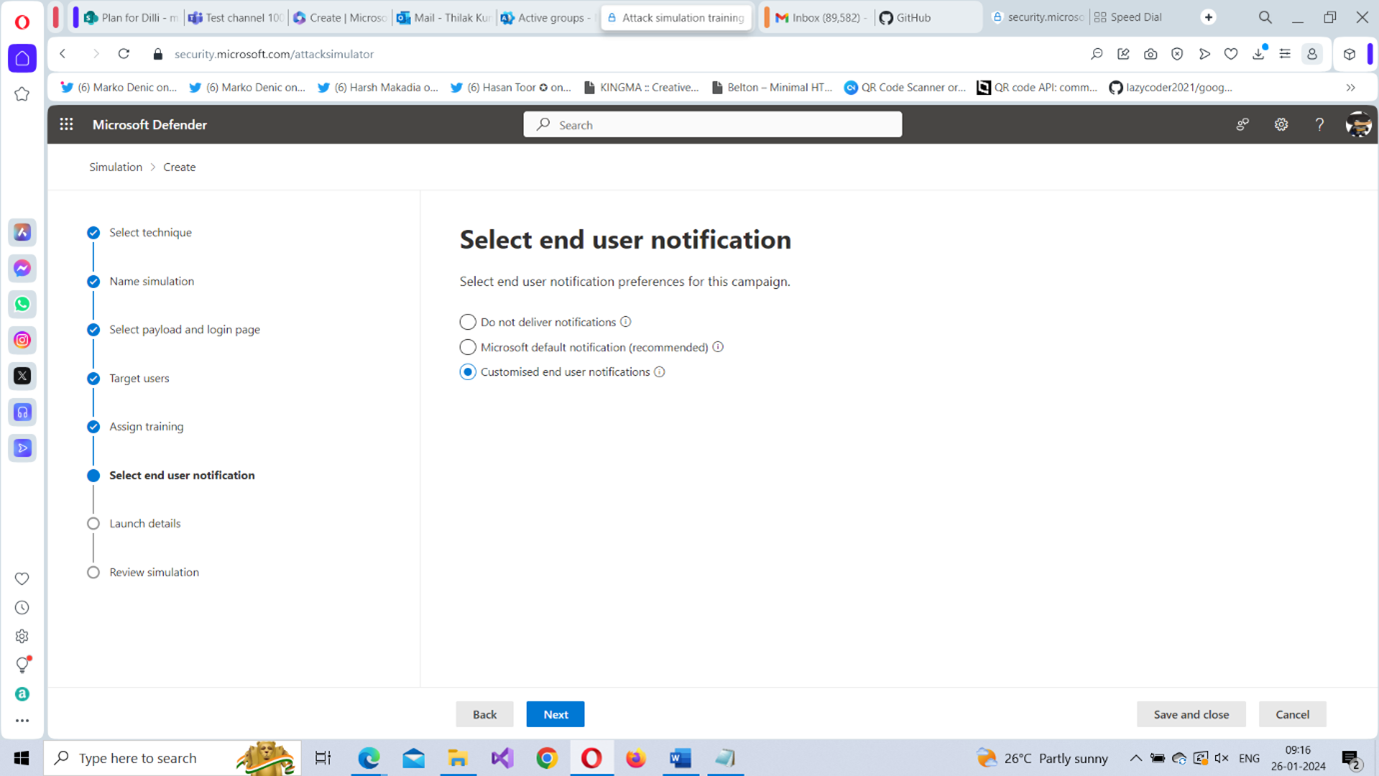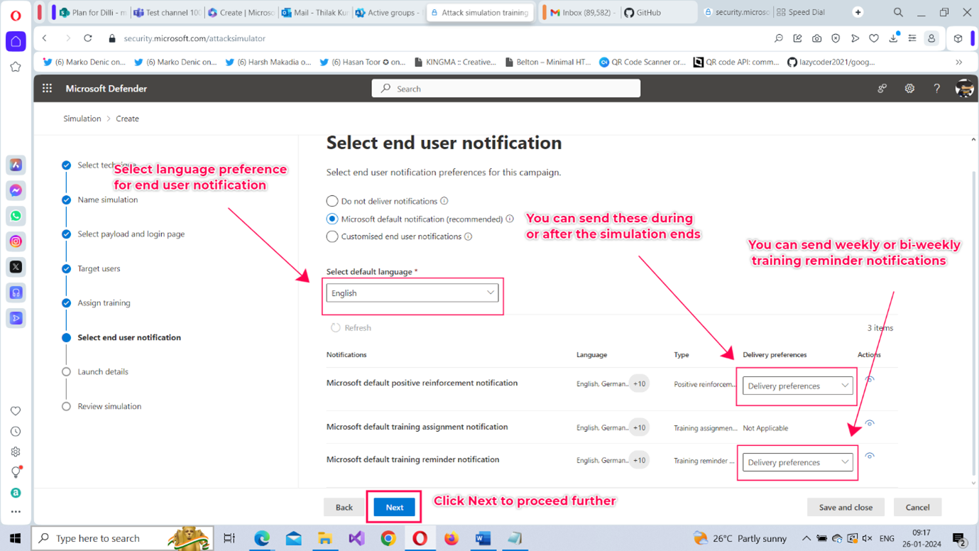 Microsoft default notification (recommended) – Microsoft default notifications are delivered. The best option to choose for the launch of your first simulation attack campaign.