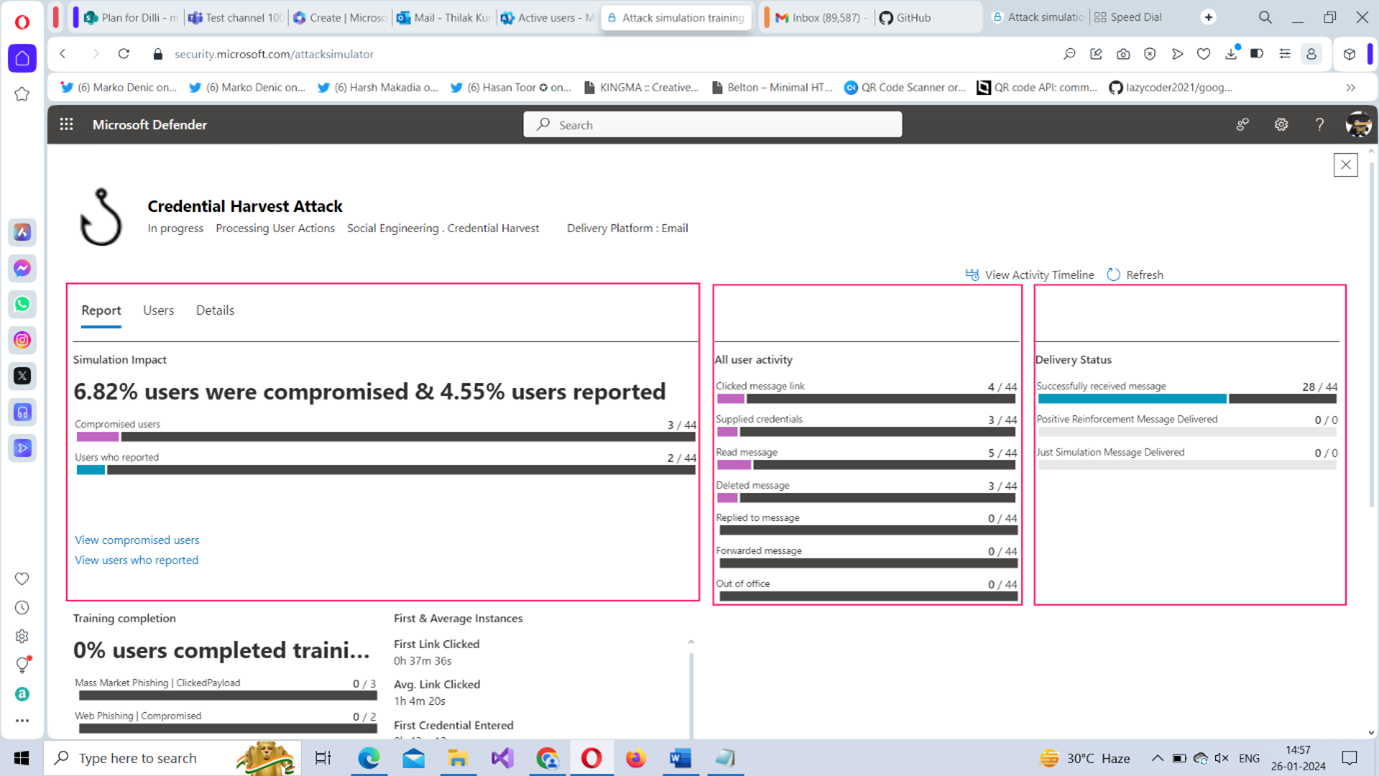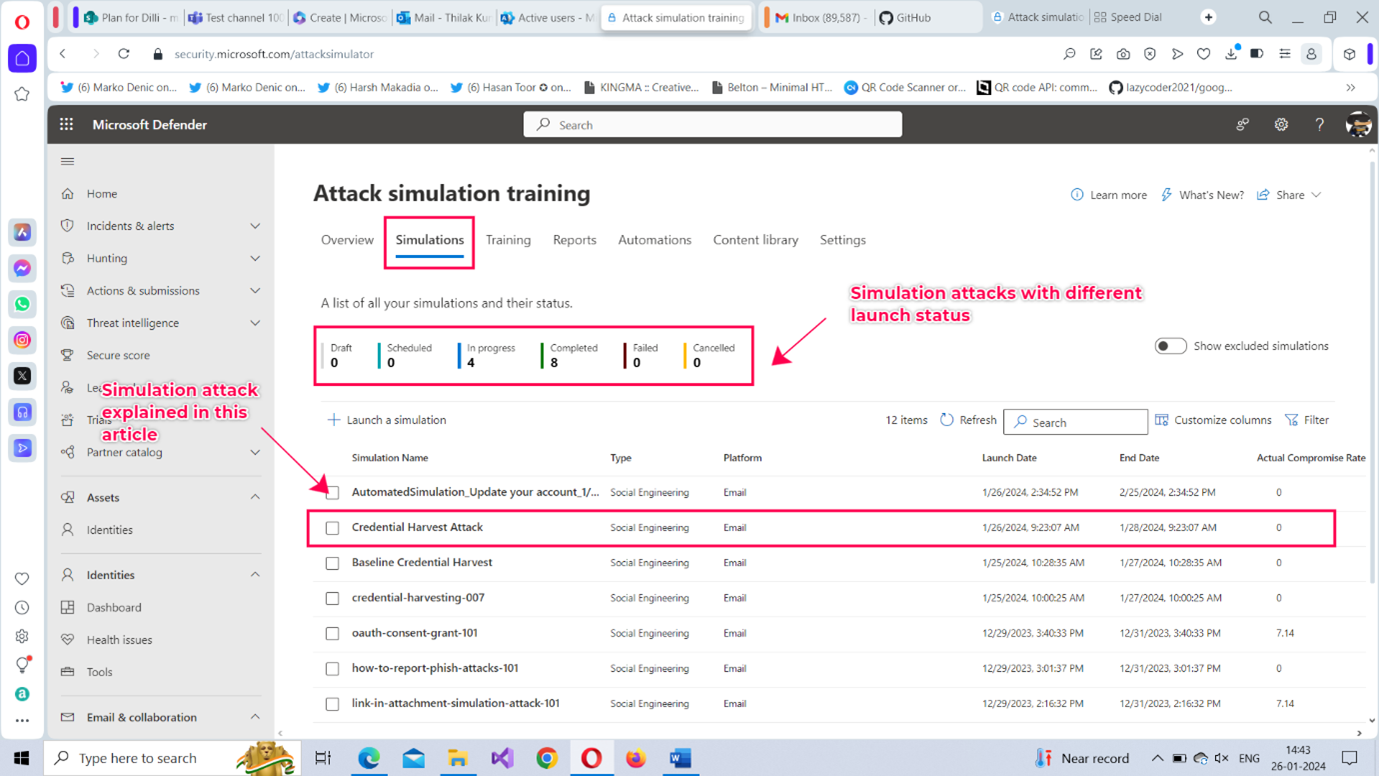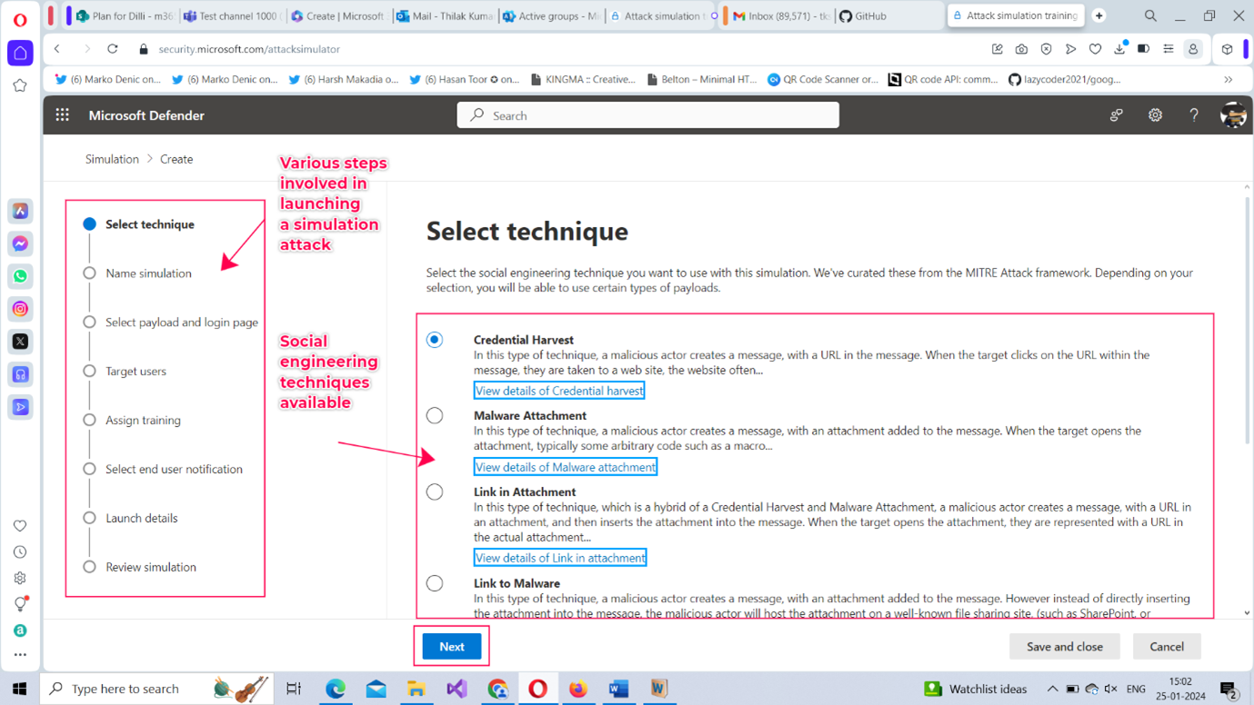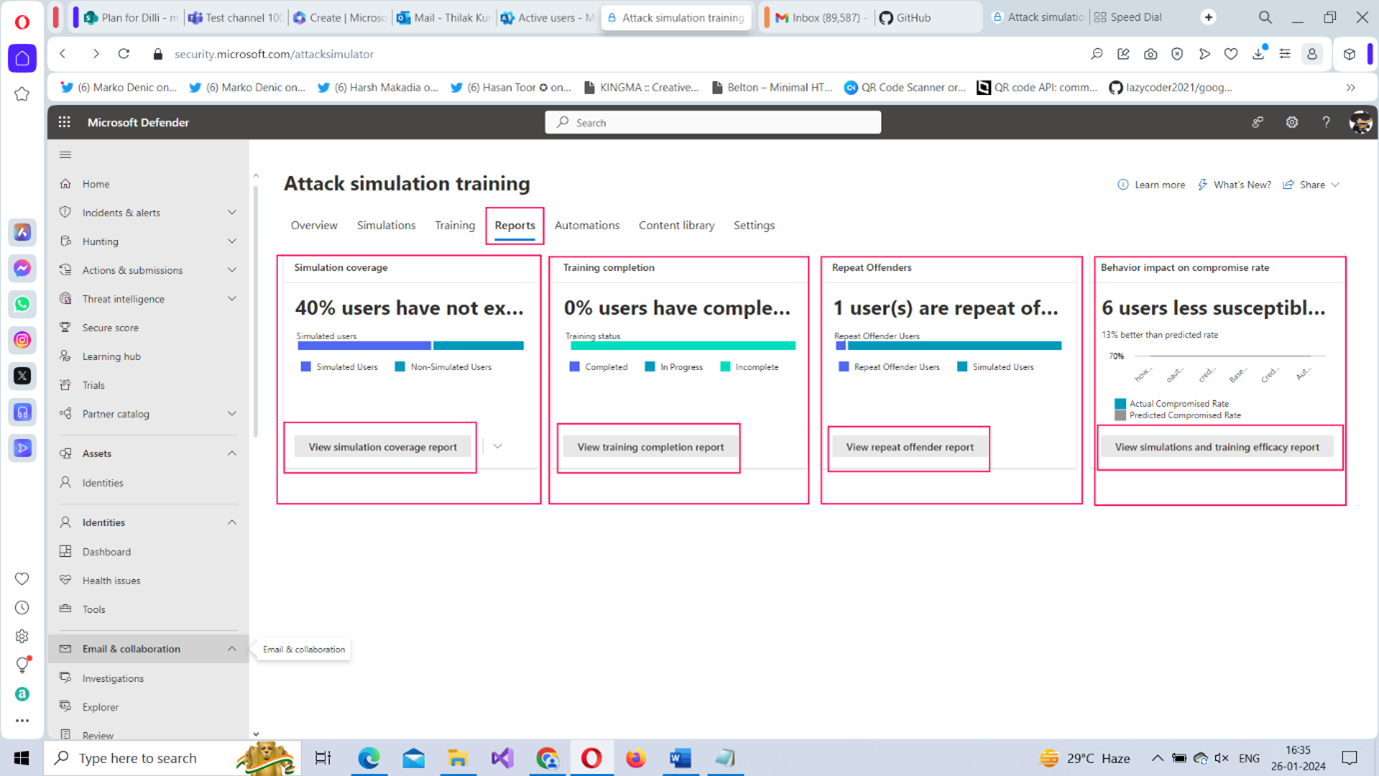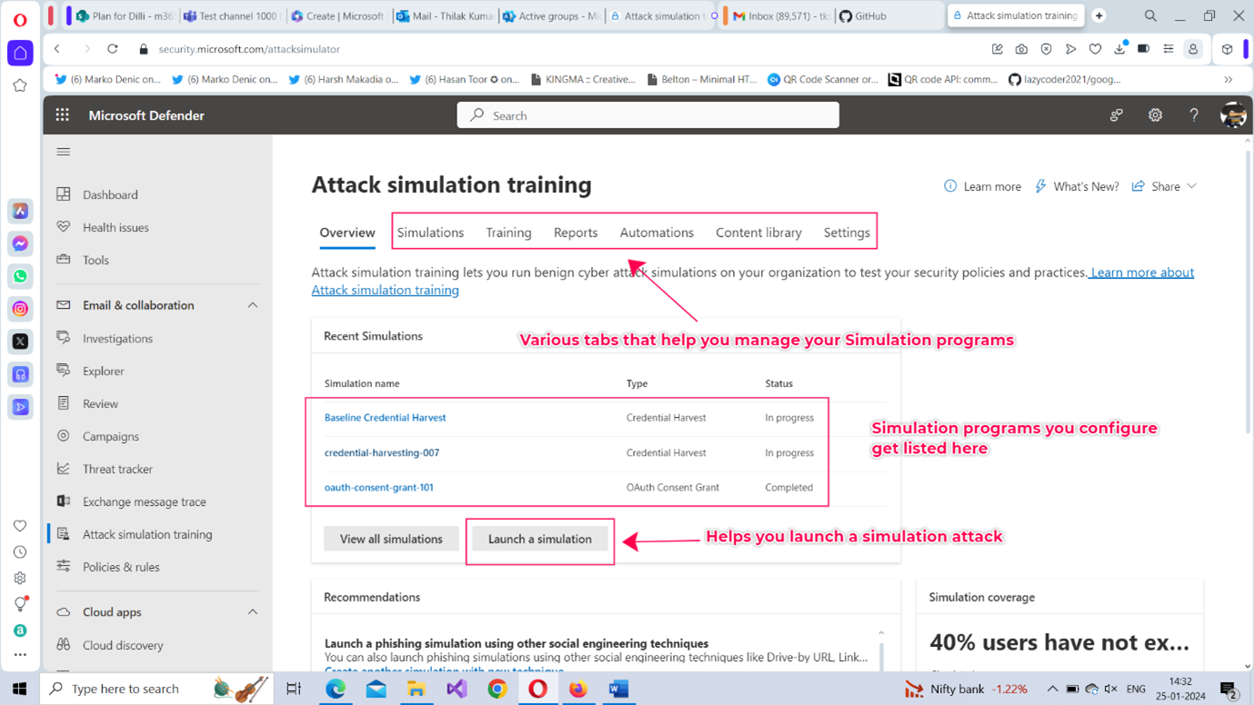 Defender for Microsoft 365 helps you launch different kinds of simulation attacks on your users to test their security awareness. It simulates many social engineering attacks like credential harvesting, malware attachments, drive-by URLs, etc., that help your users become proactive against various cyber-security threats. These simulation programs also help you set up Microsoft-recommended training programs for those who fail these security attacks.
