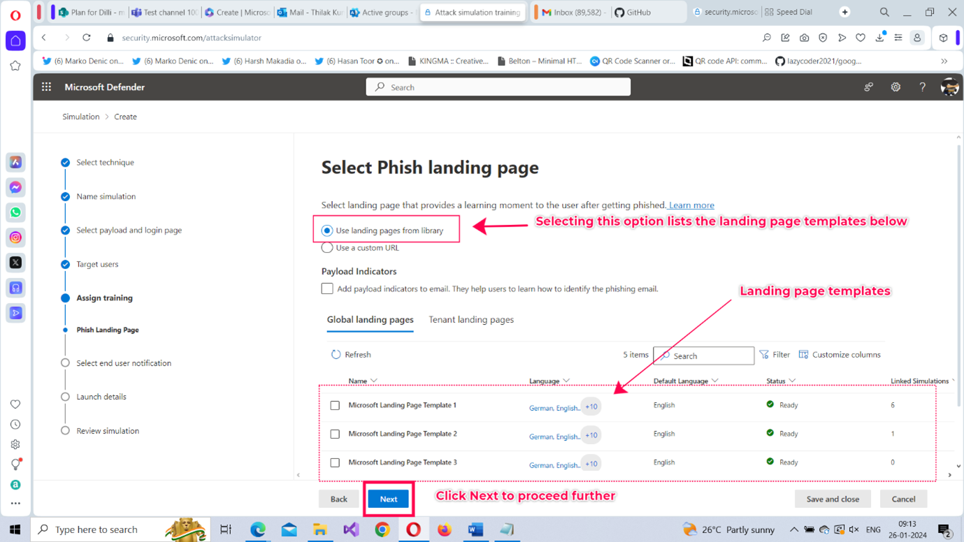 Select Phish landing page: : Here you can select the page the targets would land on once they get phished. You can either select the landing page from the library or use a custom URL (if you have your landing page set up) as shown in Figure 9.