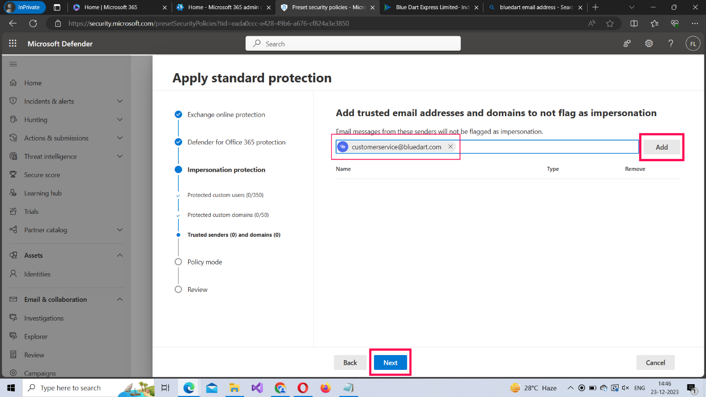 Step 3: Trusted senders and domains: Here you can add legitimate email addresses and domains so that they don’t get flagged unnecessarily. Enter the email address or the domain name, click the Add button, and then click the Next button to proceed further as shown in Figure 11. Note: You can add multiple email addresses or domains.