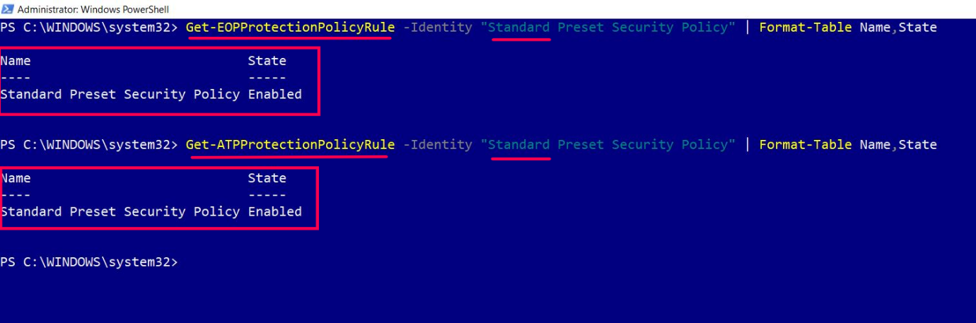 Note: Microsoft Defender for Office 365 was previously known as Advanced Threat Protection (ATP). That’s the reason why the Get-ATPProtectionPolicy cmdlet is still used to query for Microsoft Defender standard preset policy state.