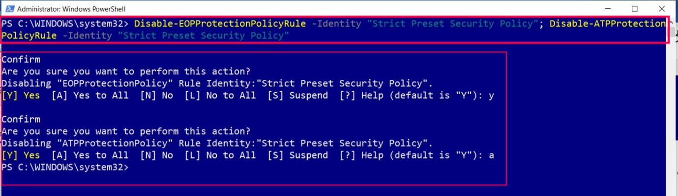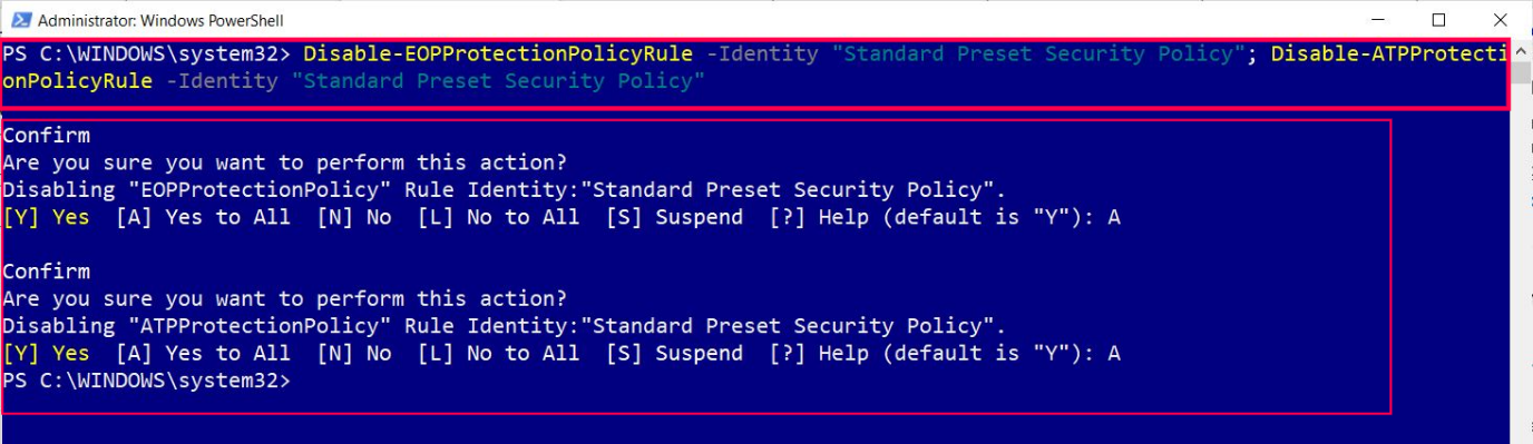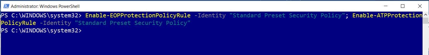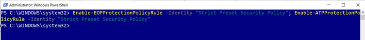 Note: Cmdlets Disable-EOPProtectionPolicyRule and Disable-ATPProtectionPolicyRule can be executed at the same time by separating them using a ‘;’ as shown in Figure 16.