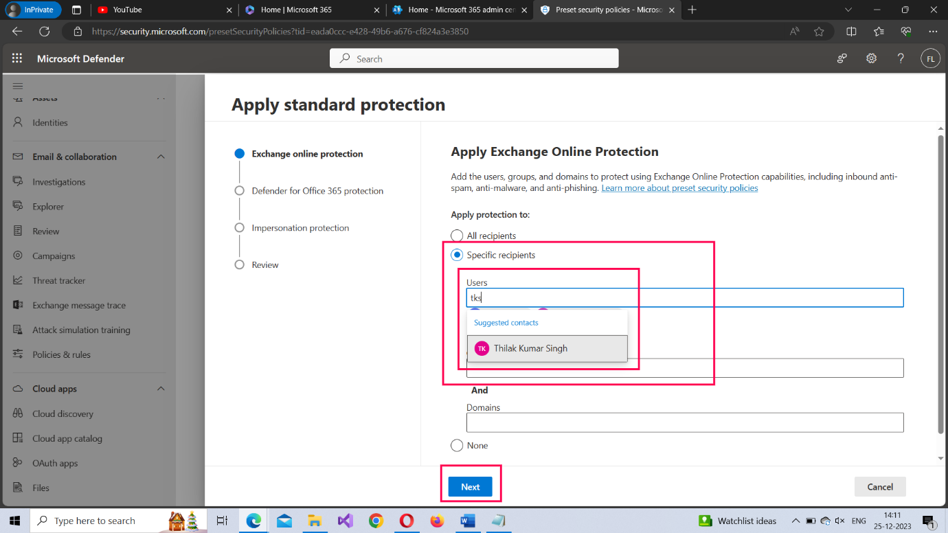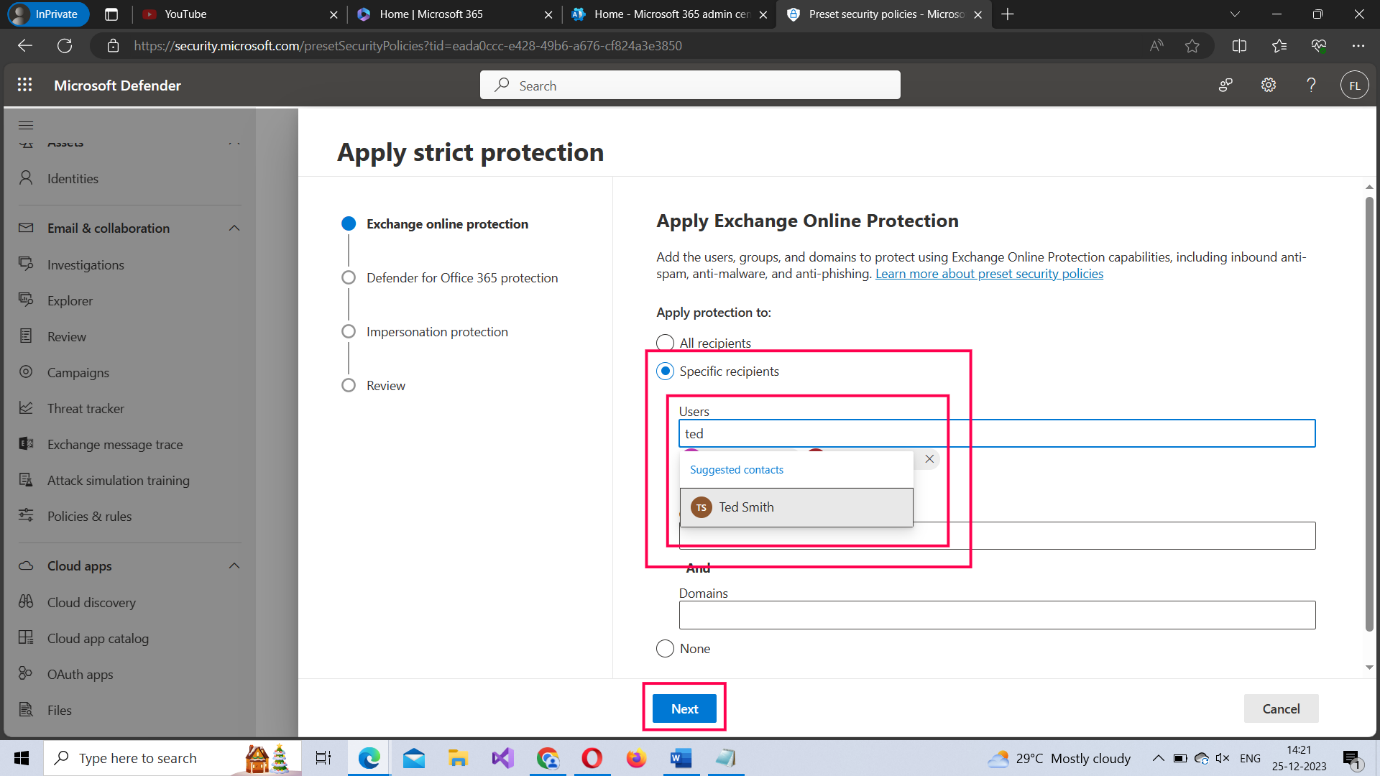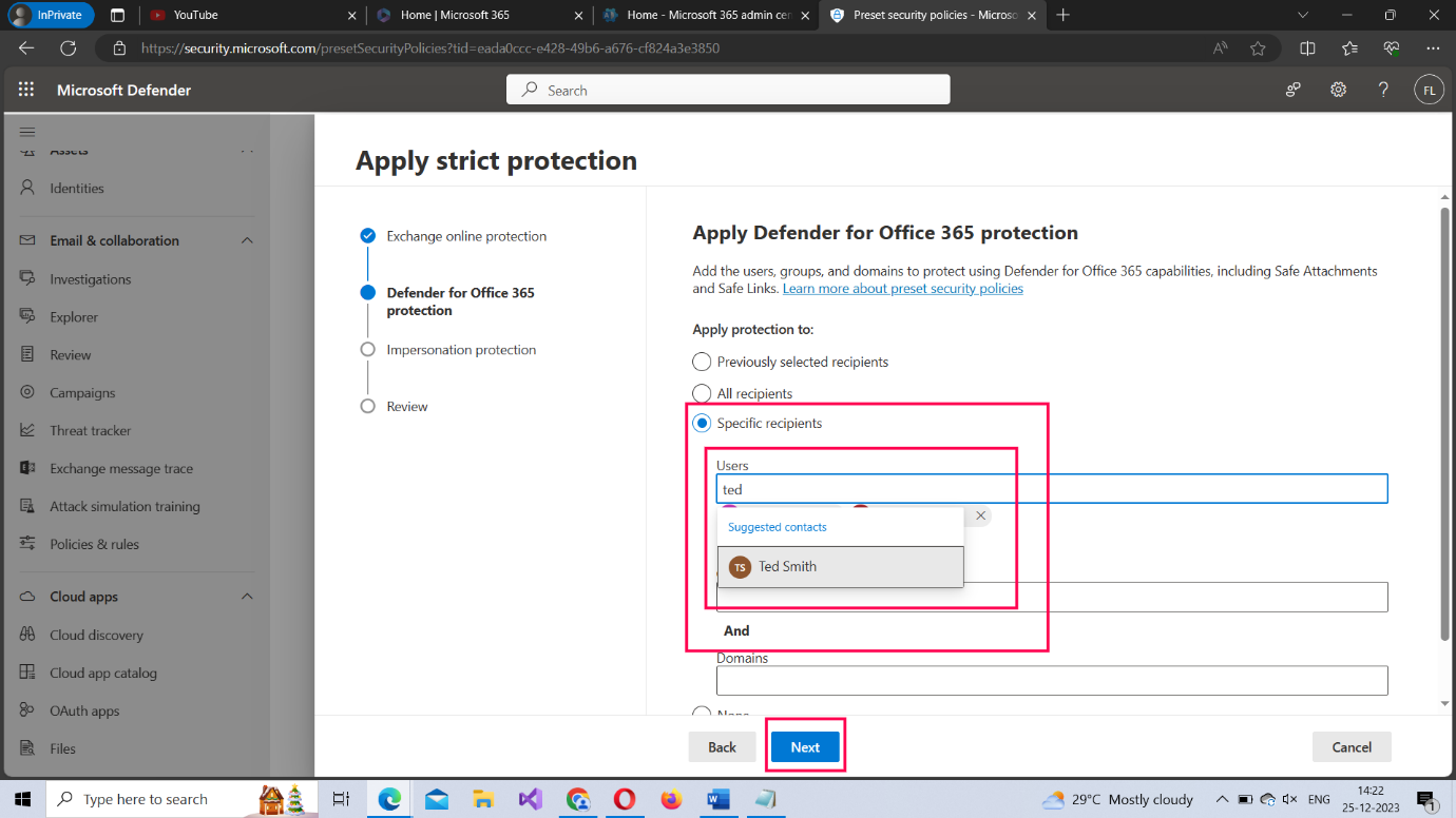 Figure 6: Selecting specific users for applying the Defender for Office 365 protection
