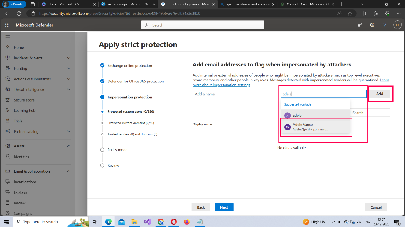 Step 1: Protected custom users: This involves adding users – both insiders and outsiders - who you believe have a chance of being impersonated. Messages from detected impersonations get quarantined for further investigation. Enter the email address of the user and select the user from the appearing list as shown in Figure 8, then click the Add button as shown in Figure 9. Finally, click the Next button to proceed further. Note: You can add multiple users.