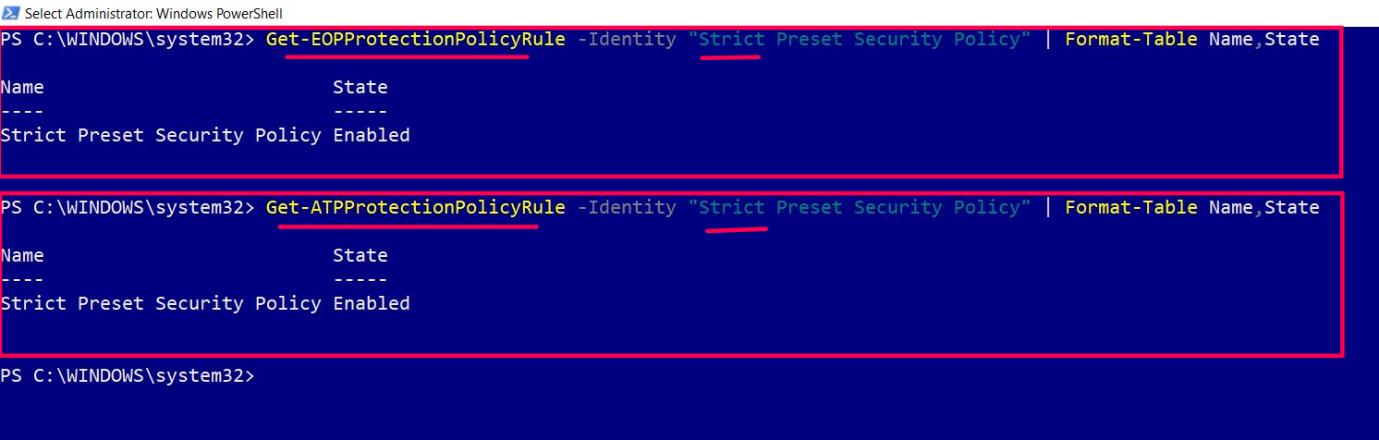 Run the following PowerShell cmdlets to check whether the strict preset security policy is currently in a turned on or off state.