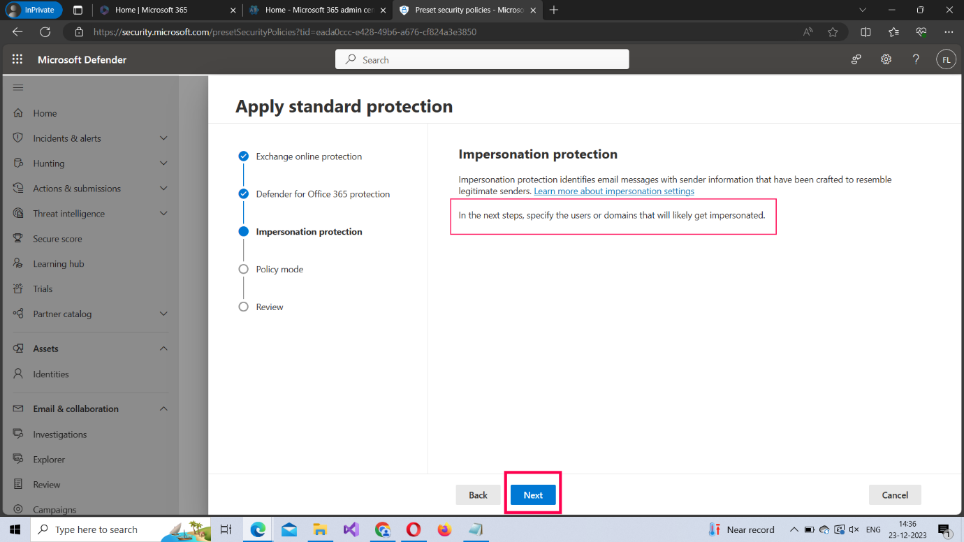The Impersonation Protection dialog opens as shown in Figure 7. This feature helps you prevent malicious actors from impersonating your tenant users and legitimate message senders thereby preventing phishing attacks of different kinds. Click Next to proceed further.