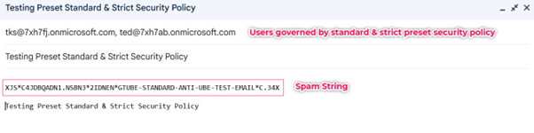 Note: If copying/pasting the above string doesn’t work, get the link directly from here: SpamAssassin: The GTUBE (apache.org). Spam assassin is a simple tool that helps you simulate spam mails so that you can test your email security. As they suggest on their website, the preset standard and strict security policies contain the spam filter that recognizes the string pattern as spam and acts on the mail as per their security controls.