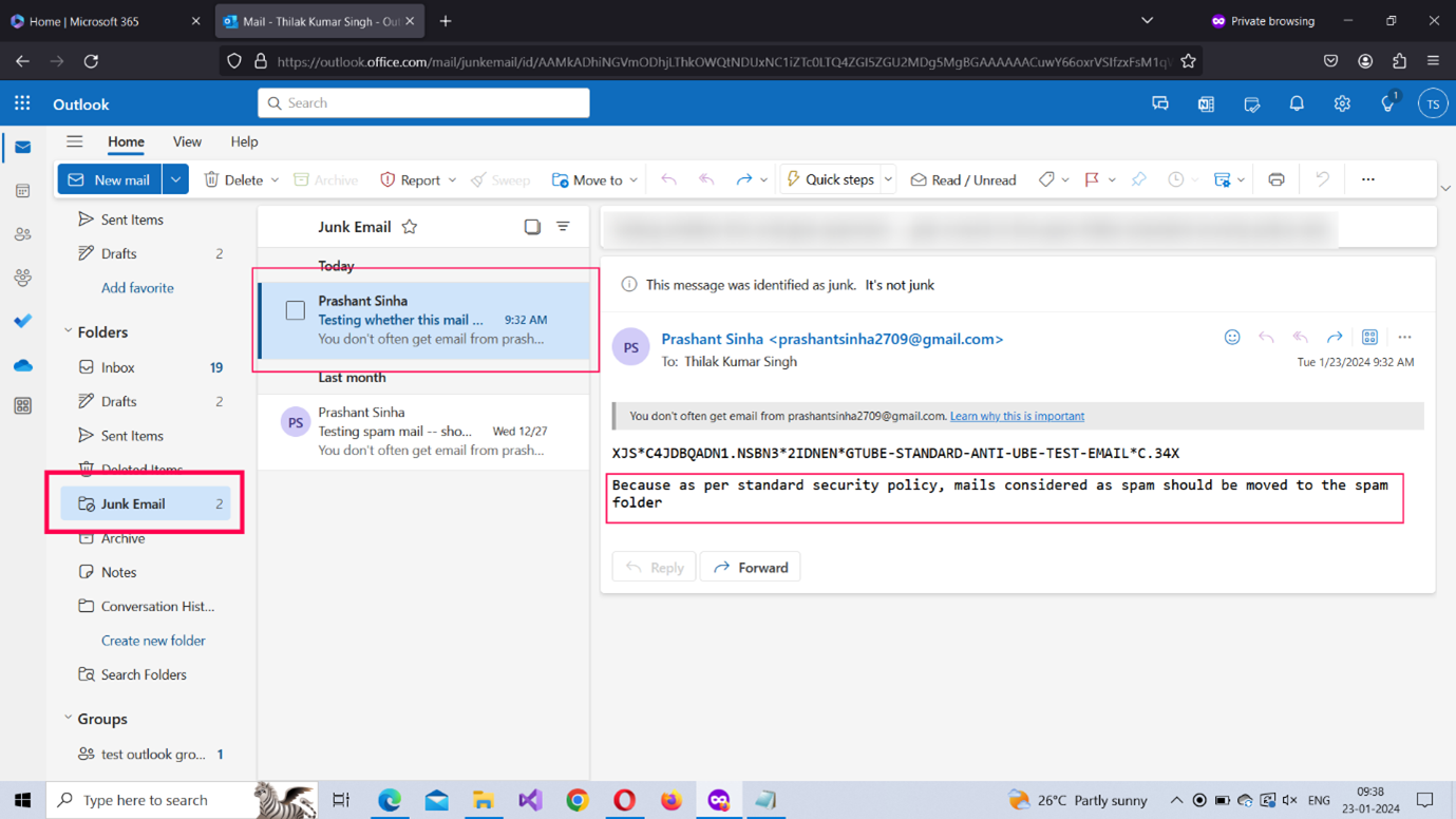 The Microsoft 365 user governed by the standard security policy receives the mail in the junk folder as shown in Figure 2. Once the standard security policy recognizes the mail as spam, it junks the mail so that the user is not disturbed by it.
