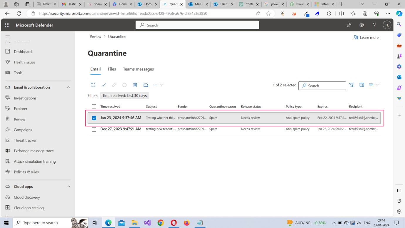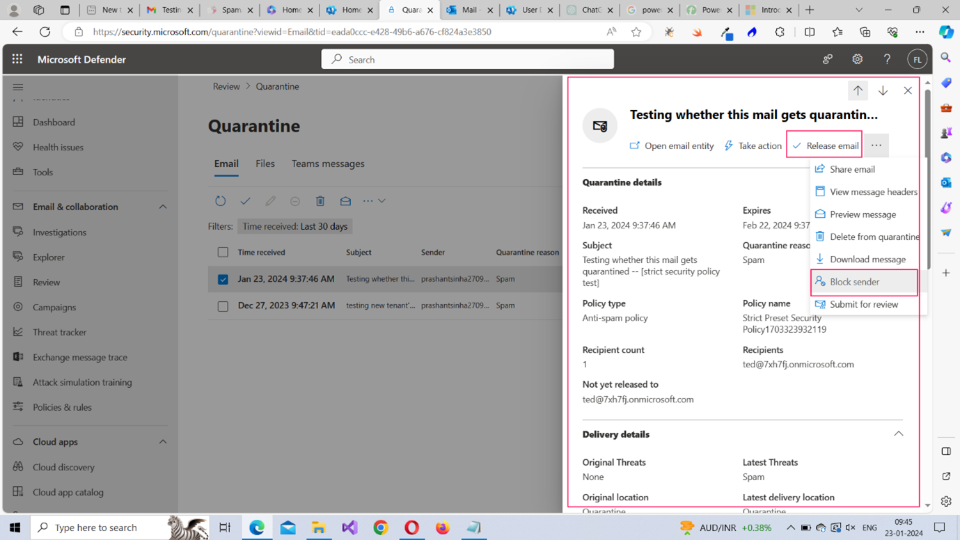 The Microsoft 365 user governed by the strict security policy does not receive the mail. Once the strict security policy recognizes the mail as spam, it quarantines the mail for admin review as shown in Figure 3.