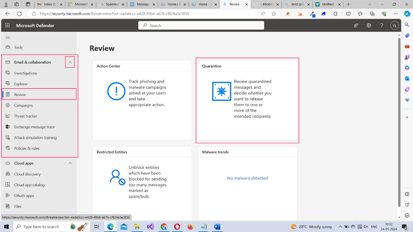 Note: You should visit Email & collaboration >> Review page >> Select Quarantine section in the Microsoft Defender portal to access and review the quarantined messages as shown in Figure 5.