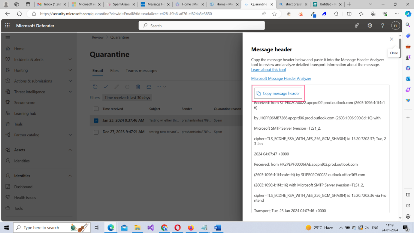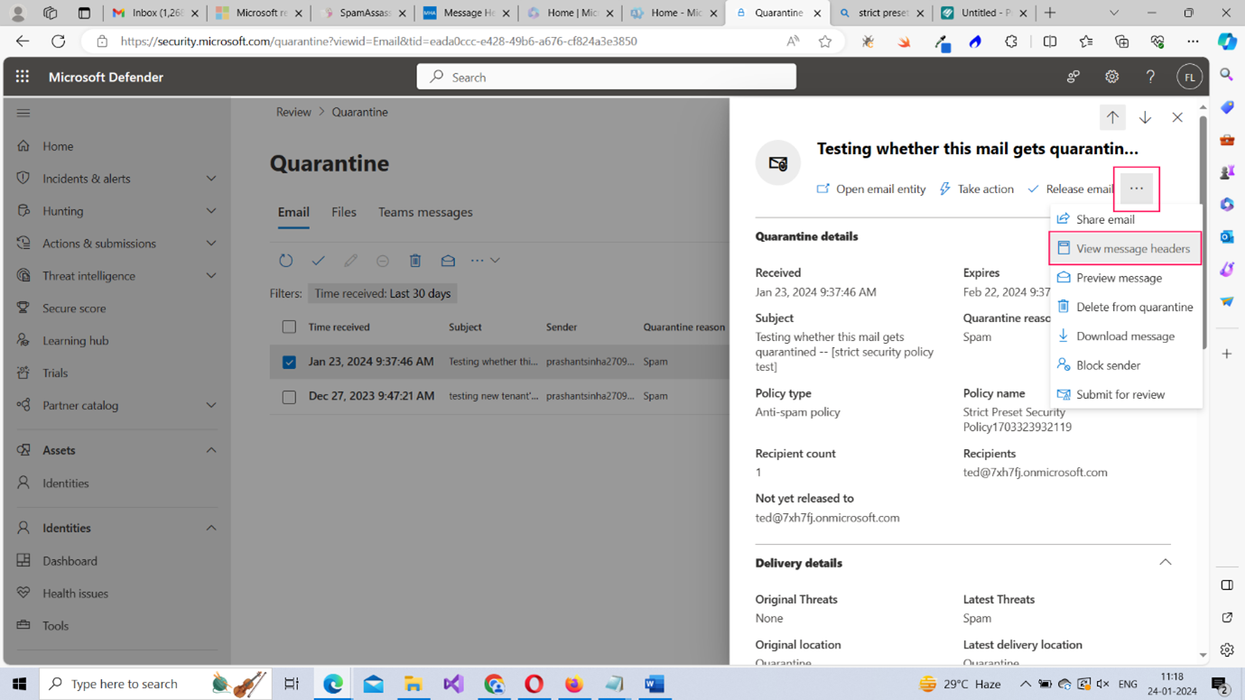 Select the quarantined mail and select the View message headers option from the mail details flyout that opens up as shown in Figure 7. Then click the Copy message header button to copy the message header from the Message header section as shown in Figure 8.