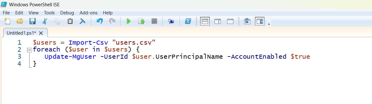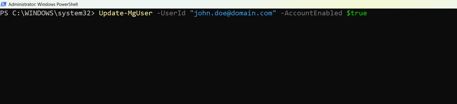 Update-MgUser -UserId "john.doe@domain.com" -AccountEnabled $true