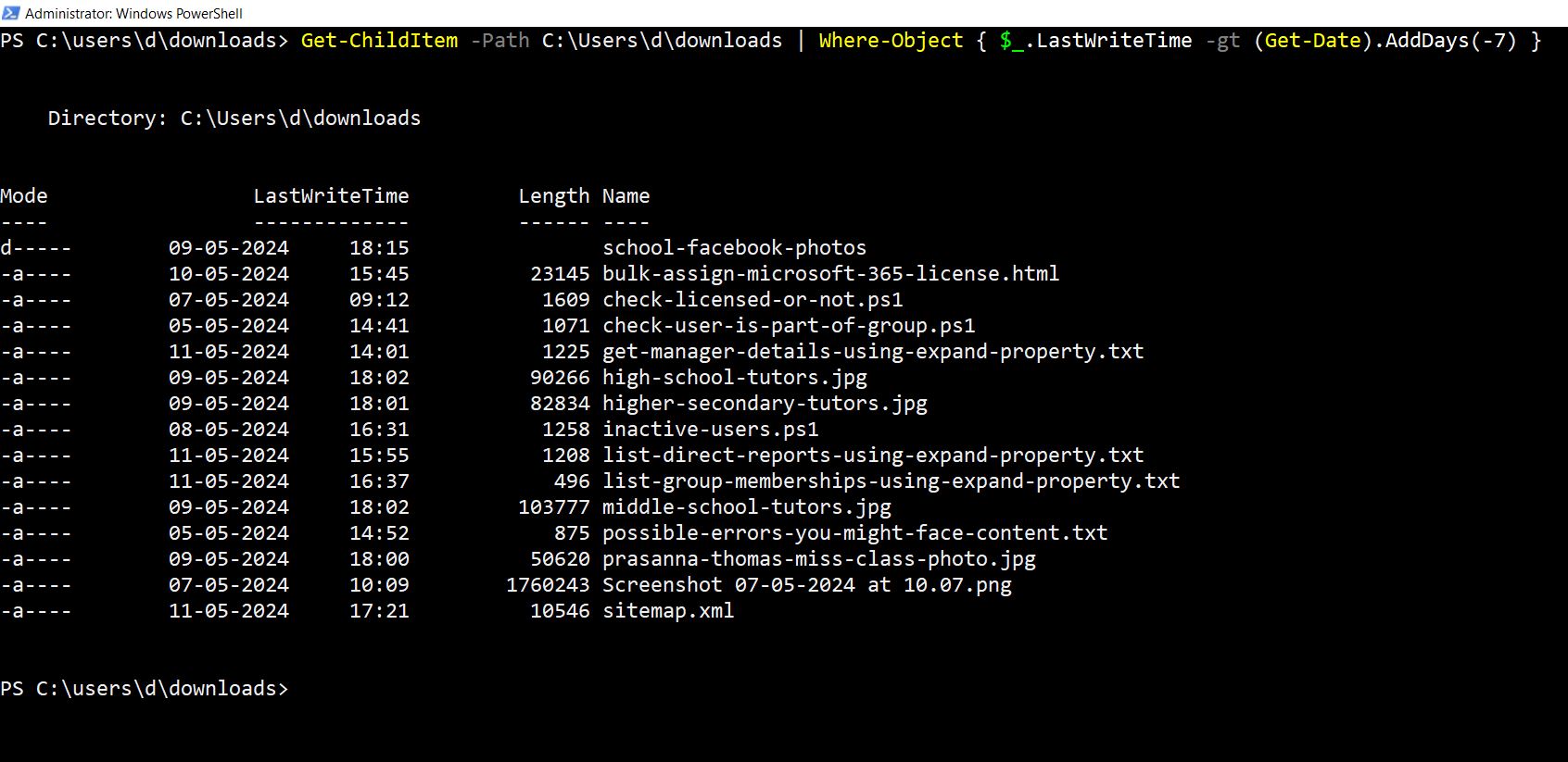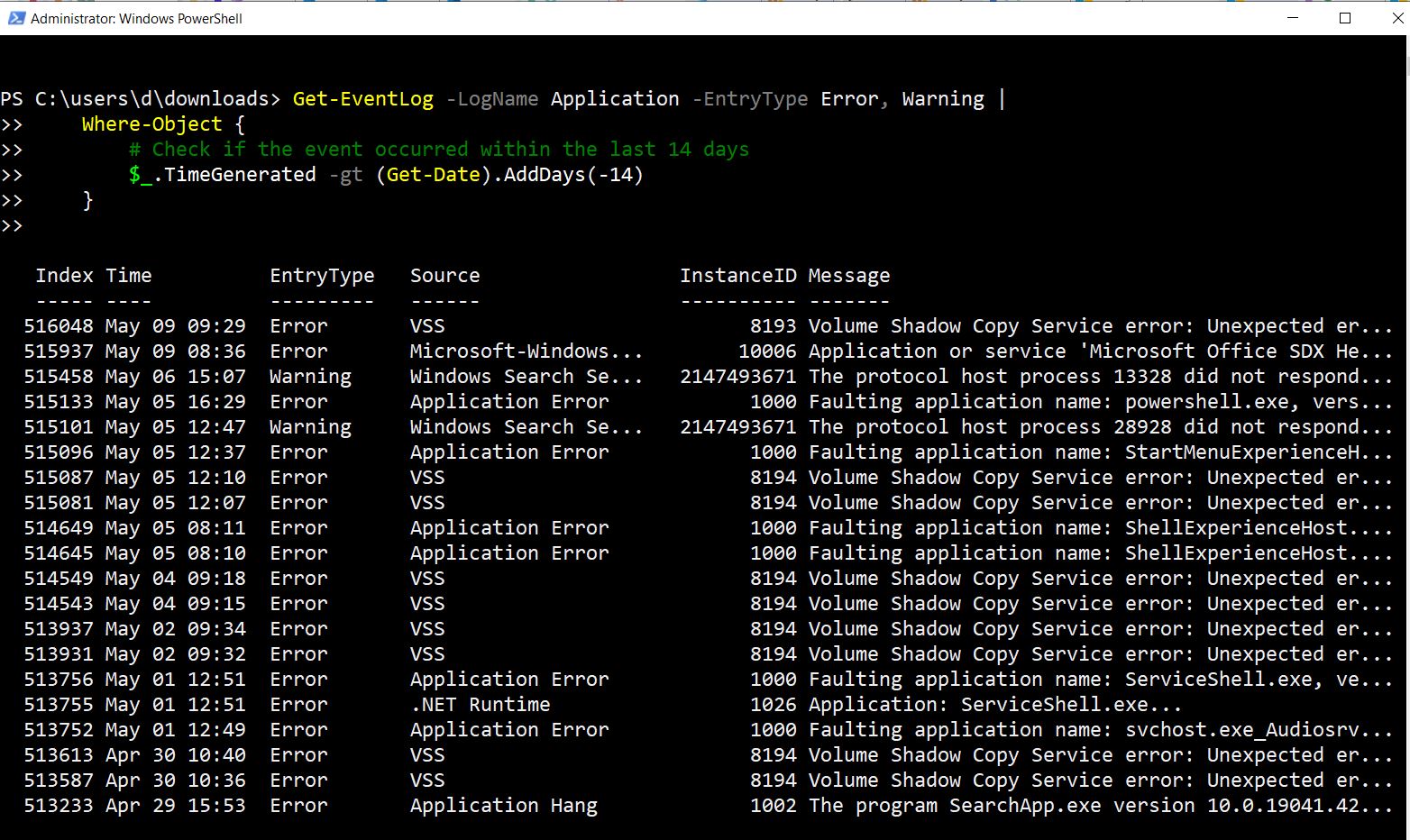 Suppose you are managing a network of computers and need to filter event logs to find specific error events that occurred during the night shift (between 10 PM and 6 AM) and had a severity level of "Error" or "Warning". Additionally, you only want logs from the last 7 days, then your script would be: