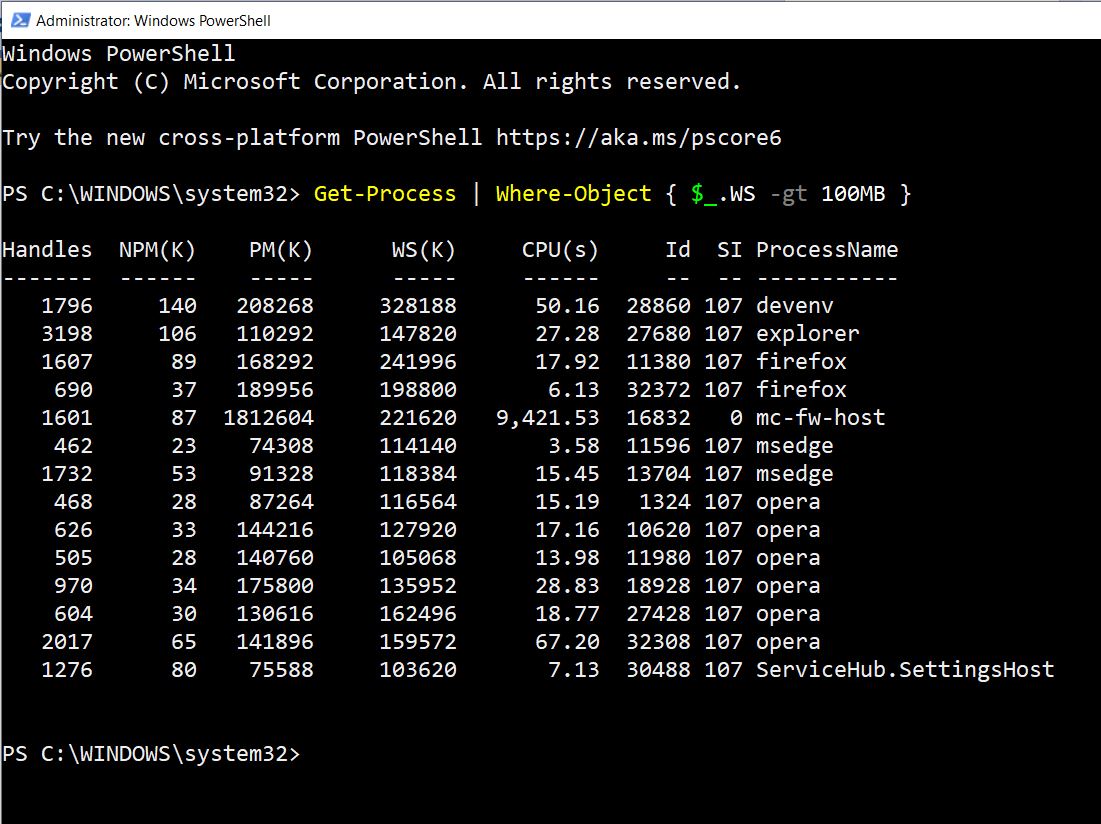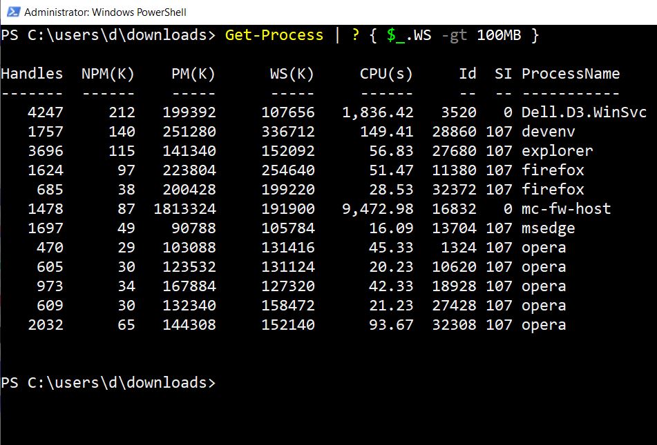 Suppose you want to find all processes that are using more than 100 MB of memory. You can use the Where-Object cmdlet as follows: